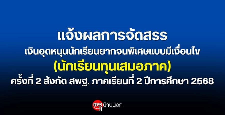 แจ้งผลการจัดสรรเงินอุดหนุนนักเรียนยากจนพิเศษแบบมีเงื่อนไข (นักเรียนทุนเสมอภาค) ครั้งที่ 2 สังกัด สพฐ. ภาคเรียนที่ 2 ปีการศึกษา 2568