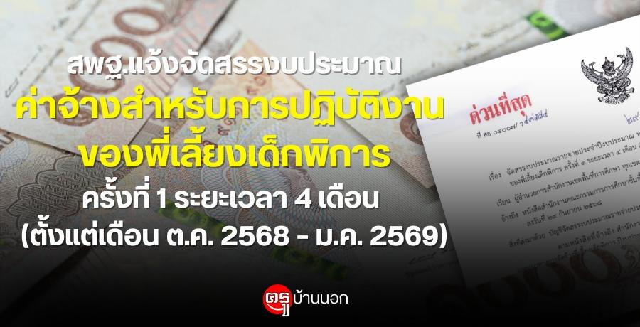 สพฐ.แจ้งจัดสรรงบประมาณรายจ่ายประจำปีงบประมาณ พ.ศ. 2569 เพื่อเป็นค่าจ้างสำหรับการปฏิบัติงาน ของพี่เลี้ยงเด็กพิการ ครั้งที่ 1 ระยะเวลา 4 เดือน (ตั้งแต่เดือน ต.ค. 2568 - ม.ค. 2569)