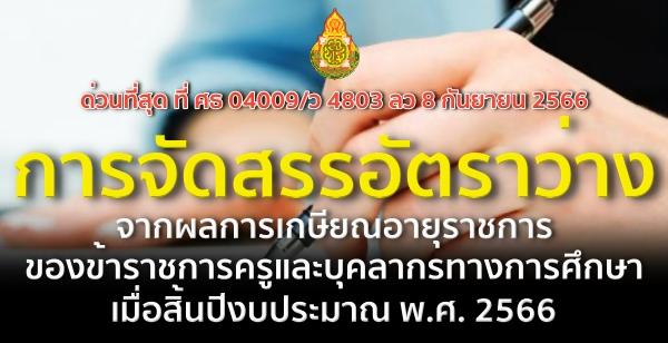 ด่วนที่สุด ที่ ศธ 04009/ว 4803 ลว 8 กันยายน 2566 เรื่อง การจัดสรรอัตราว่างจากผลการเกษียณอายุราชการของข้าราชการครูและบุคลากรทางการศึกษา เมื่อสิ้นปีงบประมาณ พ.ศ. 2566