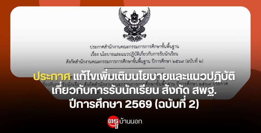 ประกาศสำนักงานคณะกรรมการการศึกษาขั้นพื้นฐาน เรื่อง แก้ไขเพิ่มเติมนโยบายและแนวปฏิบัติเกี่ยวกับการรับนักเรียน สังกัด สพฐ. ปีการศึกษา 2569 (ฉบับที่ 2)