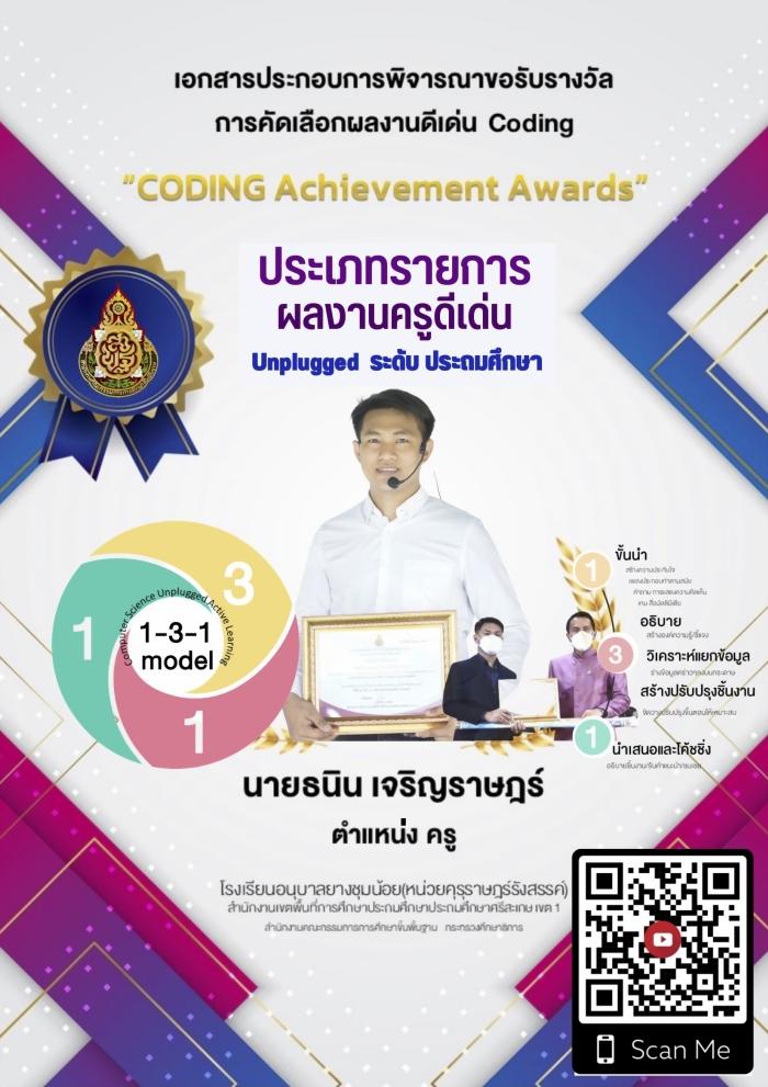 ผลงานการประกวดรางวัล Coding (Coding Achievement Awards) ประจำปีการศึกษา 2564-2565 ประเภท Unplugged Coding ระดับประถมศึกษา : ธนิน เจริญราษฎร์