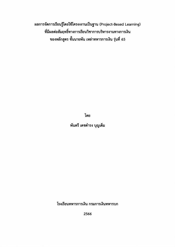 ผลการจัดการเรียนรู้โดยใช้ปัญหาเป็นฐาน (Problem-Besed Learning) ที่มีผลต่อสัมฤทธิ์ทางการเรียนวิชาการบริหารงานทางการเงิน ของหลักสูตร ชั้นนายพัน เหล่าทหารการเงิน รุ่นที่ 65 : พันตรี เดชดำรง บุญเต็ม