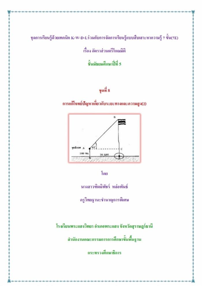ชุดการเรียนรู้ด้วยเทคนิค K-W-D-Lร่วมกับการจัดการเรียนรู้แบบสืบเสาะหาความรู้ 7 ขั้น (7E) เรื่อง อัตราส่วนตรีโกณมิติ ผลงานครูฑิตถิพัชร์ หล่อพันธ์