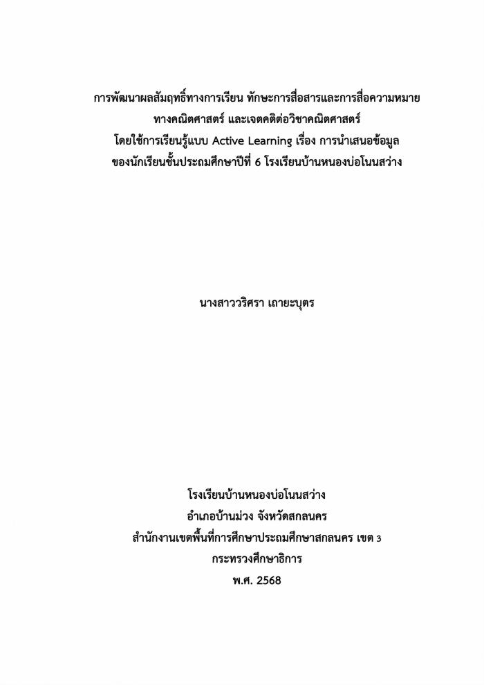 การพัฒนาผลสัมฤทธิ์ทางการเรียน ทักษะการสื่อสารและการสื่อความหมาย ทางคณิตศาสตร์ และเจตคติต่อวิชาคณิตศาสตร์ โดยใช้การเรียนรู้แบบ Active Learning : วริศรา เถายะบุตร