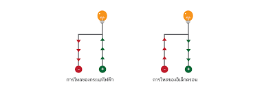 รูปขวา ทิศทางกระแสไฟฟ้าตามการไหลของอิเล็คตรอน