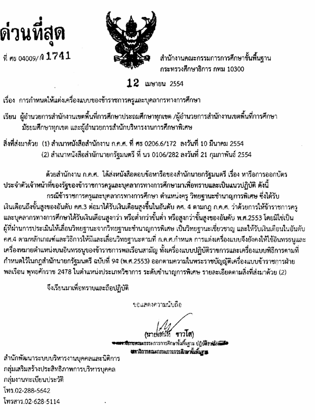 ด่วนที่สุด ที่ ศธ 04009/ว1741 การกำหนดให้แต่งเครื่องแบบของข้าราชการครูและบุคลากรทางการศึกษา (18 เม.ย. 2554)