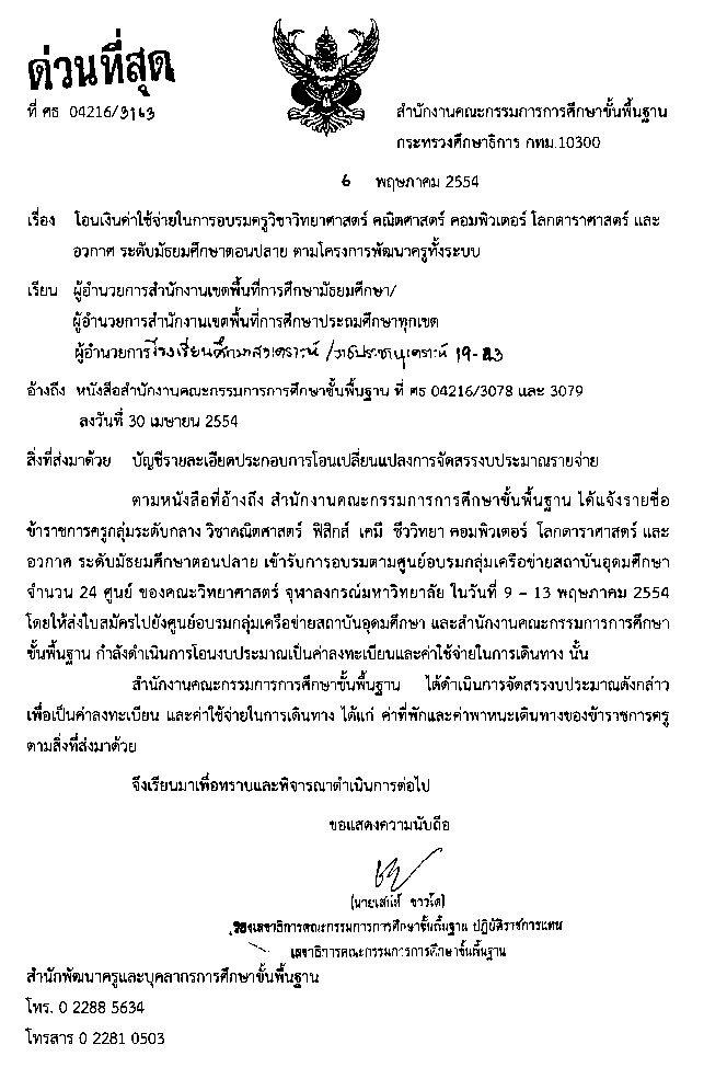 การโอนเงินค่าใช้จ่ายในการอบรมครูวิชาวิทยาศาสตร์ คณิตศาสตร์ คอมพิวเตอร์ โลกดาราศาสตร์ และอวกาศ ระดับมัธยมศึกษาตอนปลาย ตามโครงการพัฒนาครูทั้งระบบ