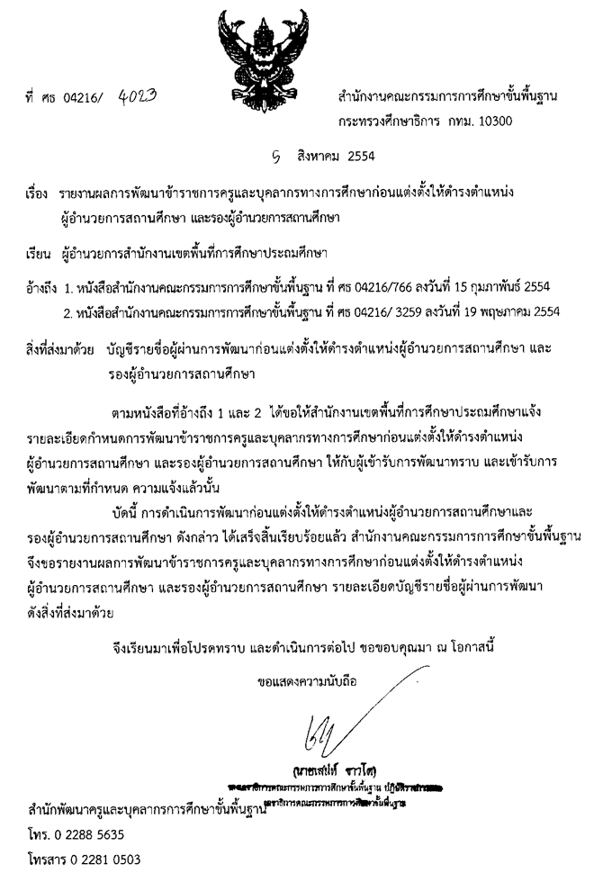 รายงานผลการพัฒนาข้าราชการครูและบุคลากรทางการศึกษาก่อนแต่งตั้งให้ดำรงตำแหน่งผู้อำนวยการสถานศึกษา และรองผู้อำนวยการสถานศึกษา