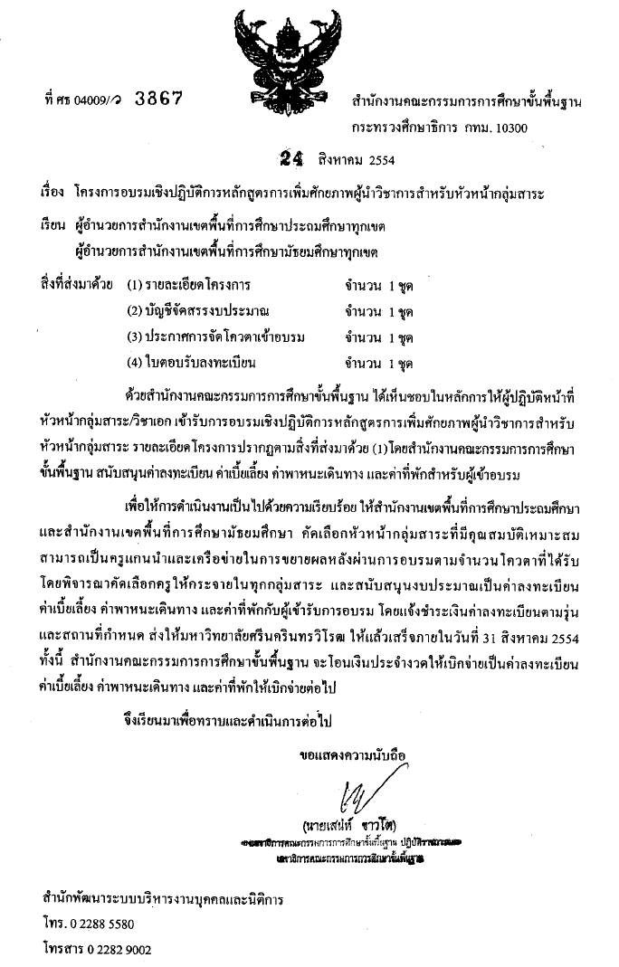 ที่ ศธ 04009/ว 3867 โครงการอบรมเชิงปฏิบัติการหลักสูตรการเพิ่มศักยภาพผู้นำวิชาการสำหรับหัวหน้ากลุ่มสาระ