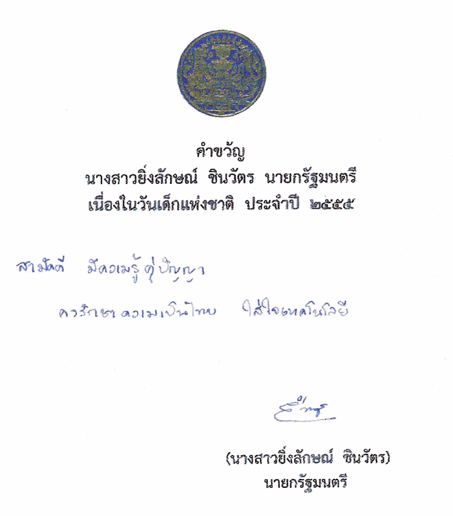 คำขวัญนายกรัฐมนตรีเนื่องในวันเด็กแห่งชาติ ประจำปี ๒๕๕๕ "สามัคคี มีความรู้ คู่ปัญญา คงรักษาความเป็นไทย ใส่ใจเทคโนโลยี"
