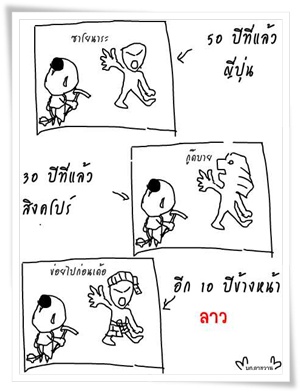 จริงๆ แล้ว ผมว่าเป็นเพราะเรามัวแต่คิดอย่างเดียว ตอนนี้เราจึงหยุดอยู่กับที่ ไม่ได้ก้าวเดินหน้า ดูเหมือนว่าเราจะถอยหลัง แต่จริงๆ แล้ว เราก็ยังบอกตัวเองอยู่ว่า บ้านเมืองเรากำลังเดินหน้าอยู่ ผมว่า ถึงจะเดิน เราก็เดินแบบช้ามาก ในขณะที่ชาติอื่นๆ เค้าไปแบบก้าวกระโดด ทุ่มงบประมาณพัฒนาด้านคนเป็นอย่างมาก