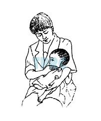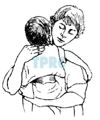 จัดท่าให้เด็กนั่งคร่อมตัวมาทางด้านหน้าเล็กน้อย (30°) บนแขนของผู้ให้การบำบัด เคาะบริเวณด้านหลังตอนบนเหนือกระดูกสะบัก ระหว่างกระดูกต้นคอและหัวไหล่
