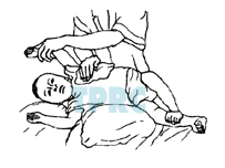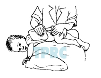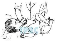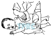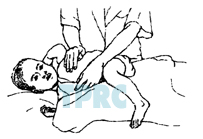 จัดให้เด็กนอนตะแคงกึ่งคว่ำหน้า ศีรษะต่ำ 30°ประคองทรวงอกบริเวณชายโครงด้านซ้ายหงายขึ้นมา เล็กน้อยเคาะบริเวณเหนือชายโครงด้านข้างตอนหน้าต่ำจากราวนมลงมาเล็กน้อย