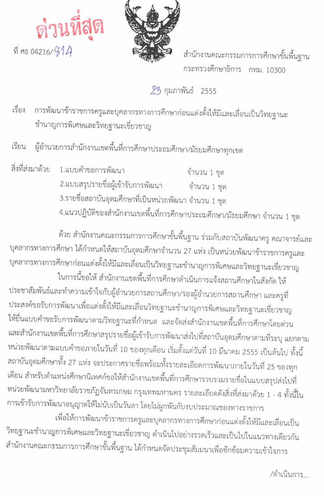 การพัฒนาข้าราชการครูและบุคลากรทางการศึกษาก่อนแต่งตั้งให้มีและเลื่อนเป็นวิทยฐานะชำนาญการพิเศษ และวิทยฐานะเชี่ยวชาญ