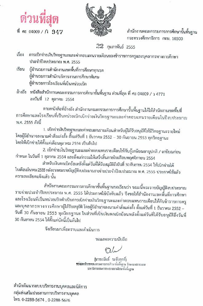 ด่วนที่สุด ที่ ศธ 04009/ว947การเบิกจ่ายเงินวิทยฐานะและค่าตอบแทนรายเดือนของข้าราชการครูและบุคลากรทางการศึกษา ประจำปีงบประมาณ พ.ศ.2555