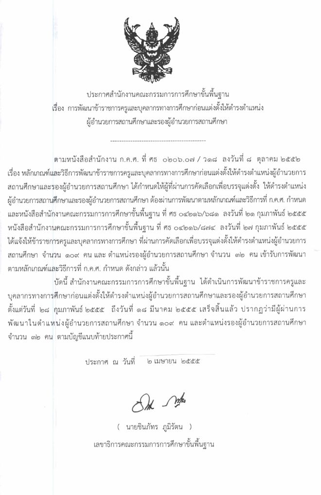 ประกาศผลการพัฒนาข้าราชการครูและบุคลากรทางการศึกษาก่อนแต่งตั้งให้ดำรงตำแหน่งผู้อำนวยการสถานศึกษาและรองผู้อำนวยการสถานศึกษา