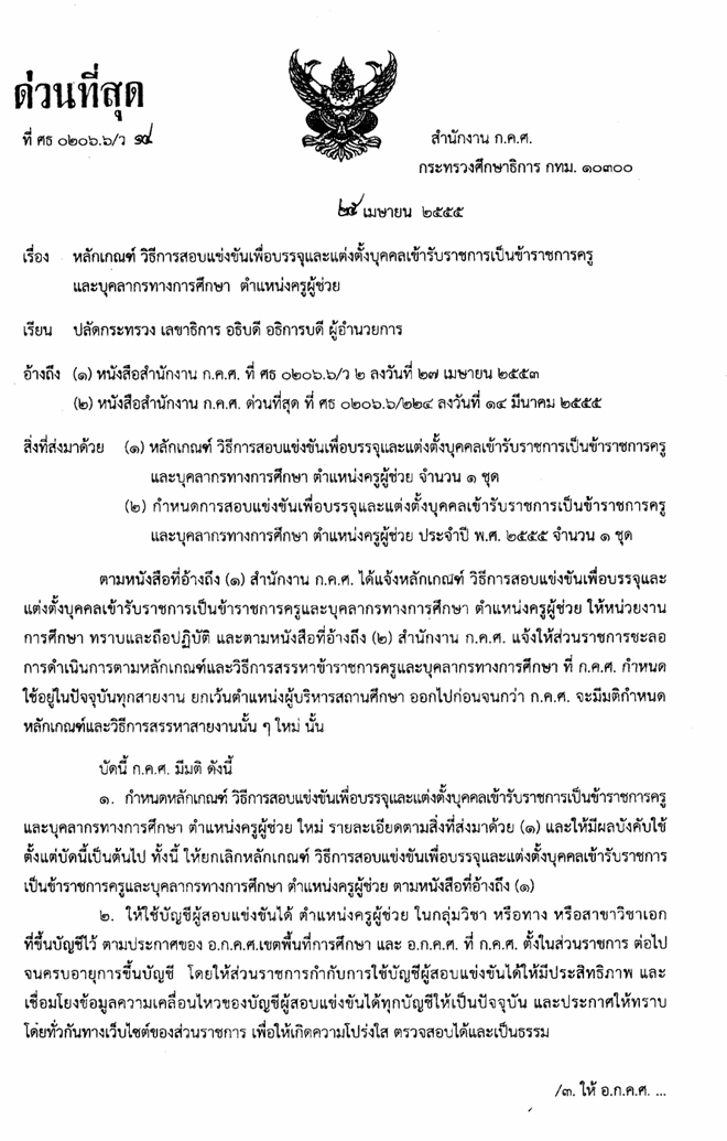 ว14 (55) หลักเกณฑ์วิธีการสอบแข่งขันเพื่อบรรจุและแต่งตั้งบุคคลเข้ารับราชการเป็นข้าราชการครูและบุคลากรทางการศึกษา ตำแหน่งครูผู้ช่วย