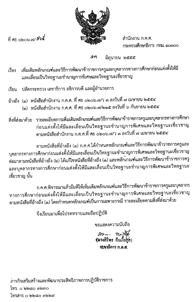 เพิ่มเติมหลักเกณฑ์และวิธีการพัฒนาข้าราชการครูและบุคลากรทางการศึกษาก่อนแต่งตั้งให้มีและเลื่อนเป็นวิทยฐานะชำนาญการพิเศษและวิทยฐานะเชี่ยวชาญ