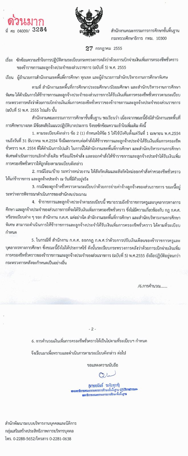 ด่วนที่สุด ที่ ศธ 04009/3284 ซักซ้อมความเข้าใจการปฏิบัติตามระเบียบกระทรวงการคลังว่าด้วยการเบิกจ่ายเงินเพิ่มการครองชีพชั่วคราวของข้าราชการและลูกจ้างประจำของส่วนราชการ(ฉบับที่ 5)พ.ศ.2555