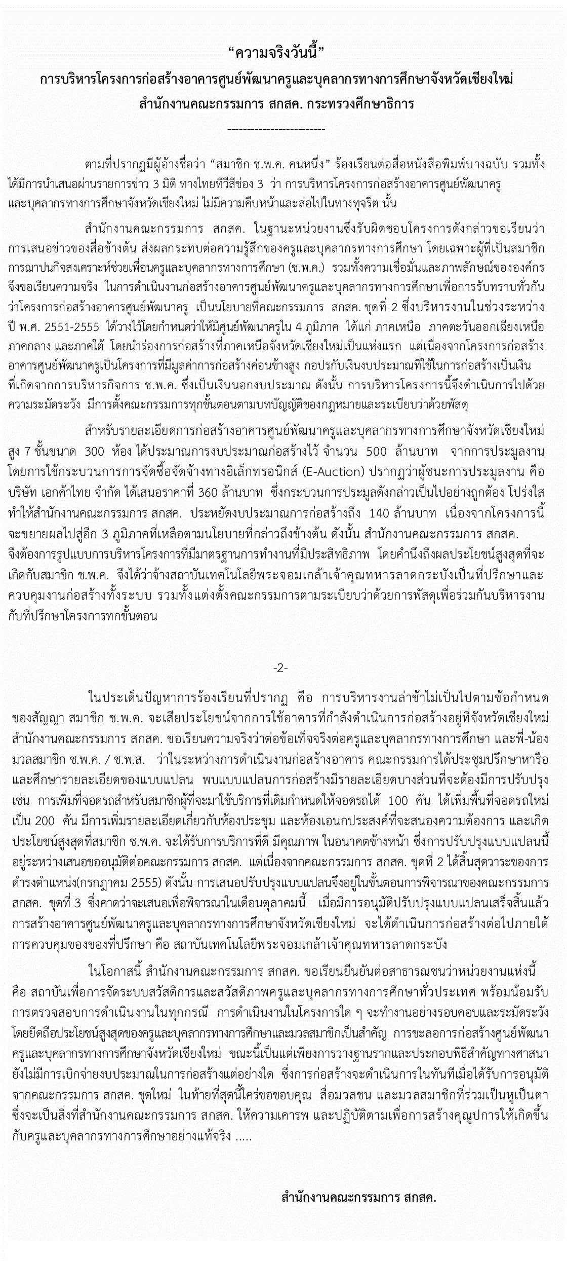 คำชี้แจง "การบริหารโครงการก่อสร้างอาคารศูนย์พัฒนาครูและบุคลากรทางการศึกษาจังหวัดเชียงใหม่ สำนักงานคณะกรรมการ สกสค."