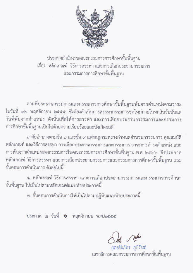 ประกาศเรื่องหลักเกณฑ์ วิธีการสรรหาและการเลือกประธานกรรมการและกรรมการการศึกษาขั้นพื้นฐาน