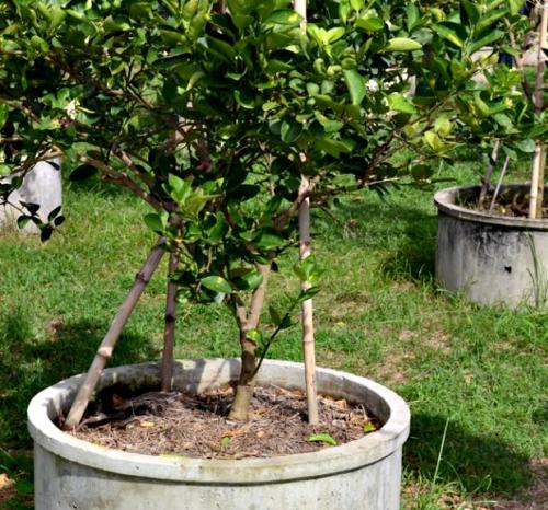 ใช้วงบ่อซีเมนต์ขนาดเส้นผ่าศูนย์กลาง 80 เซนติเมตร ฝาวงบ่อขนาดเส้นผ่าศูนย์กลาง ประมาณ 90 เซนติเมตร กว้างกว่า 10 เซนติเมตร ดินผสมที่จะใช้ควรเป็นวัสดุปลูกหลัก 3 ชนิด คือ หน้าดิน 3 ส่วน ขี้วัวเก่า 1 ส่วน และเปลือกถั่วเขียว 2 ส่วน ผสมคลุกเคล้ากัน เปลือกถั่วเขียวจะช่วยให้สภาพดินมีการระบายน้ำที่ดี ดินจำนวน 100 วงบ่อ ใช้หน้าดินประมาณ 1 คันรถสิบล้อ ปูพื้นด้วยหน้าดินเป็นขั้นแรก จากนั้นใส่ขี้วัวเก่าเป็นชั้นที่ 2 ตามด้วยเปลือกถั่วเขียวเป็นชั้นบนสุด ใช้เครื่องตีพรวนติดรถไถไถพรวน รดน้ำ 1 สัปดาห์วัสดุปลูกจะยุบตัวประมาณ 1 คืบ ขุดเปิดปากหลุมให้มีขนาดเท่ากับขนาดของถุงที่ใช้ชำปลูกต้นมะนาวให้พอดีกับระดับดินเดิม กลบดินแล้วใช้เท้าเหยียบรอบ ๆ ต้น เพื่อไม่ให้โยกคลอน ปักไม้เป็นหลักกันลมโยกและใช้ตอกมัดต้นมะนาวไว้กับหลัก ตอกจะผุเปื่อยหลังจากปลูกประมาณ 2 เดือน ซึ่งต้นมะนาวตั้งตัวได้แล้วในช่วงเริ่มแรกของการบังคับมะนาวฤดูแล้งจะทำให้ต้นมะนาวออกดอกเพียงรุ่นเดียวคือ ช่วงเดือนตุลาคม