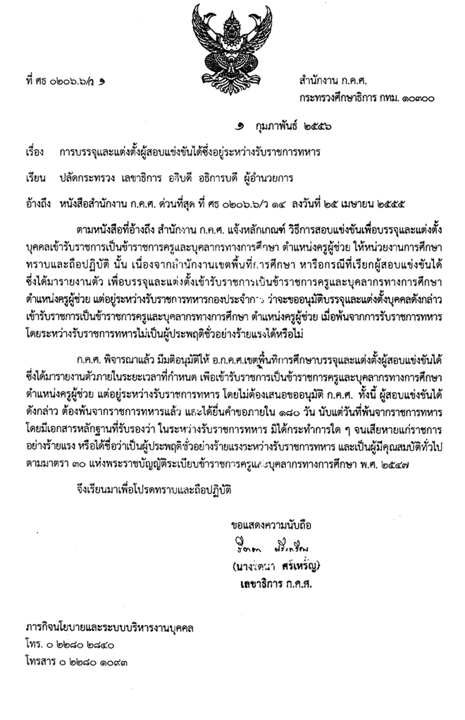 ว1/2556 การบรรจุและแต่งตั้งผู้สอบแข่งขันได้ซึ่งอยู่ระหว่างรับราชการทหาร