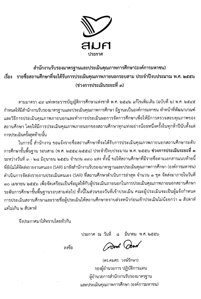 รายชื่อสถานศึกษาที่จะได้รับการประเมินคุณภาพภายนอกรอบสาม ประจำปีงบประมาณ 2556 (ช่วงการประเมินระยะที่ 3)