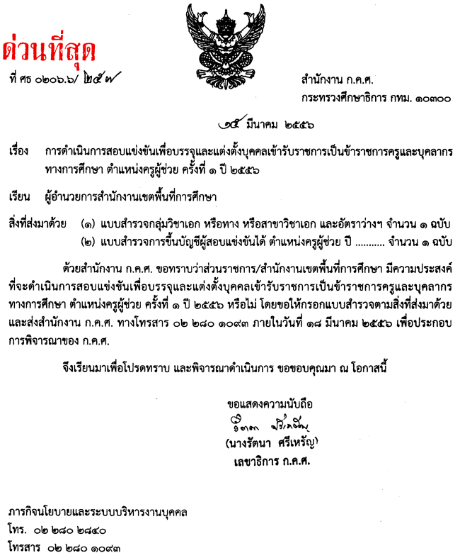 ด่วนที่สุด เรื่อง การดำเนินการสอบแข่งขันฯ ตำแหน่งครูผู้ช่วย ครั้งที่ ๑ ปี ๒๕๕๖