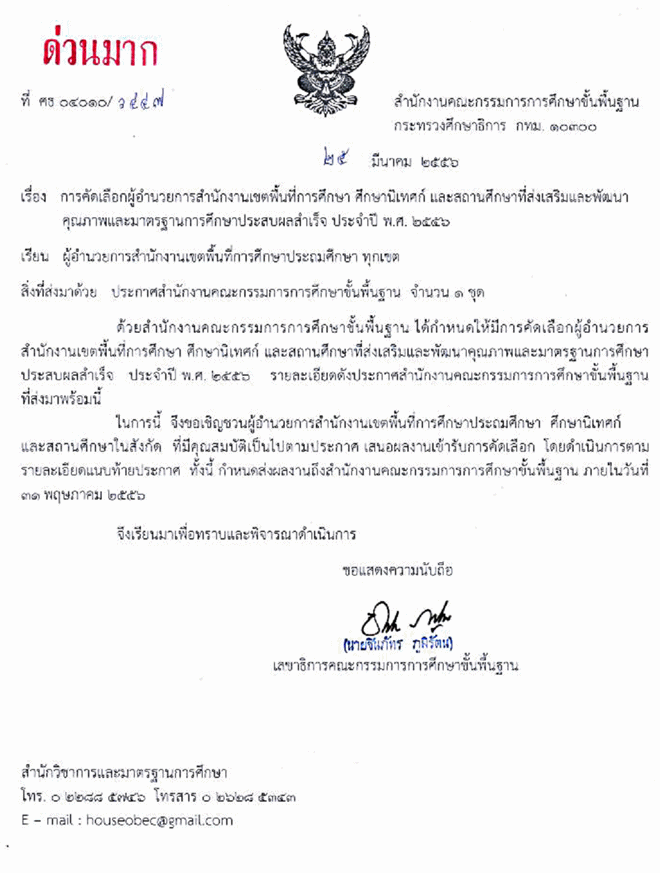 การคัดเลือกผู้อำนวยการสำนักงานเขตพื้นที่การศึกษา ศึกษานิเทศก์ และสถานศึกษาที่ส่งเสริมและพัฒนาคุณภาพและมาตรฐานการศึกษาประสบผลสำเร็จ ประจำปี พ.ศ. 2556