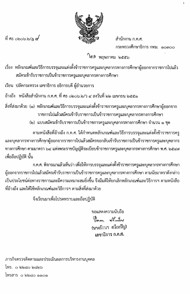 ว9/2556 หลักเกณฑ์และวิธีการบรรจุและแต่งตั้งข้าราชการครูและบุคลากรทางการศึกษาผู้ออกจากราชการไปแล้วสมัครเข้ารับราชการเป็นข้าราชการครูและบุลลากรทางการศึกษา