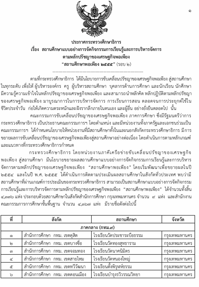 ประกาศกระทรวงศึกษาธิการ เรื่อง สถานศึกษาแบบอย่างการจัดกิจกรรมการเรียนรู้และการบริหารจัดการตามหลักปรัชญาของเศรษฐกิจพอเพียง