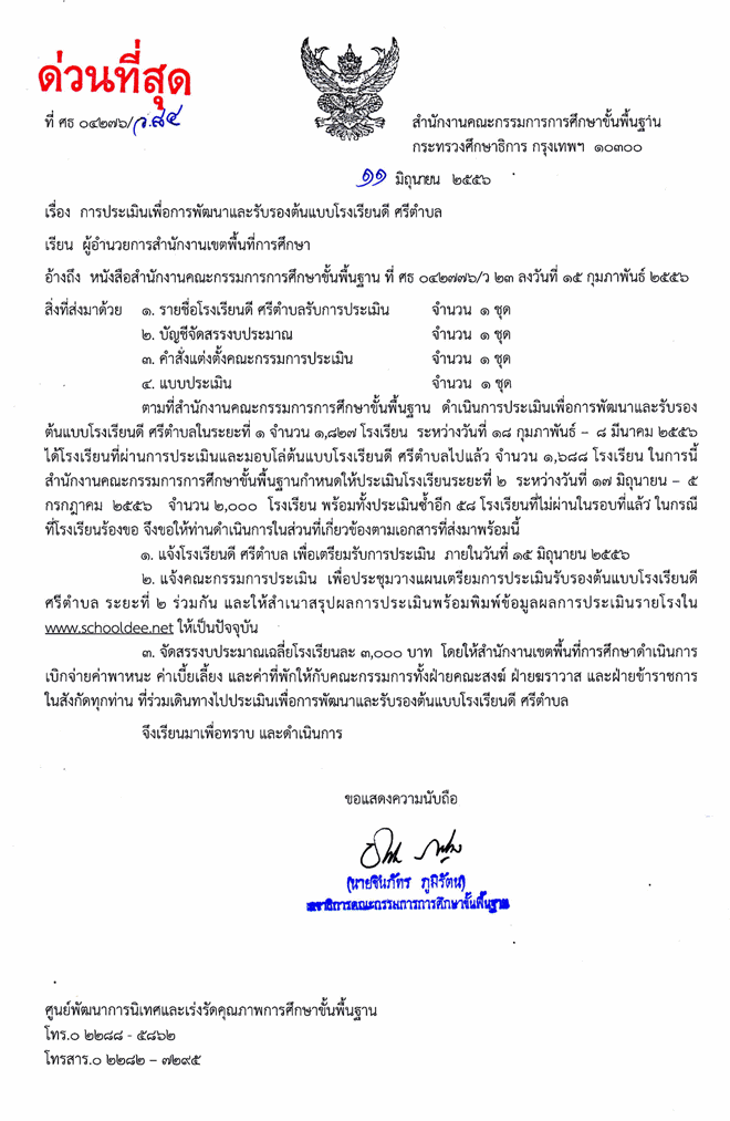 สพฐ.กำหนดให้มีการประเมินเพื่อการพัฒนาและรับรองต้นแบบโรงเรียนดี ศรีตำบล ในระยะที่ 2 ระหว่างวันที่ 17 มิถุนายน - 5 กรกฎาคม 2556 รายละเอียดดังแนบ