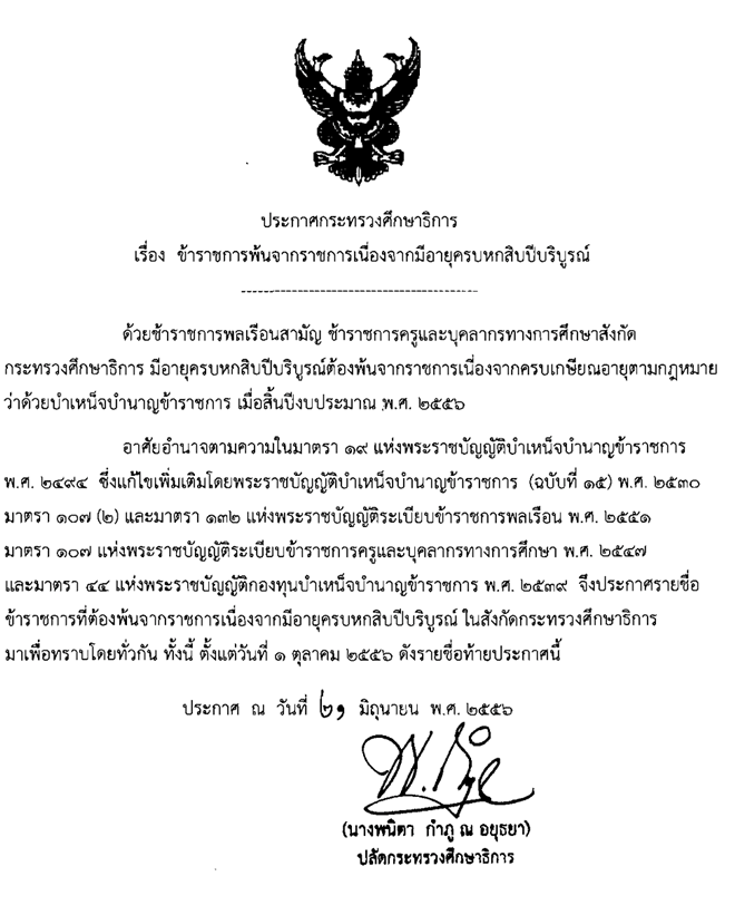 ประกาศรายชื่อข้าราชการและลูกจ้างประจำพ้นจากราชการเนื่องจากมีอายุครบ 60 ปีบริบูรณ์
