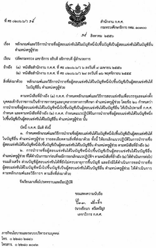 ว15/2556 หลักเกณฑ์และวิธีการนำรายชื่อผู้สอบแข่งขันได้ในบัญชีหนึ่ง ไปขึ้นบัญชีเป็นผู้สอบแข่งขันได้ในบัญชีอื่น ตำแหน่งครูผู้ช่วย