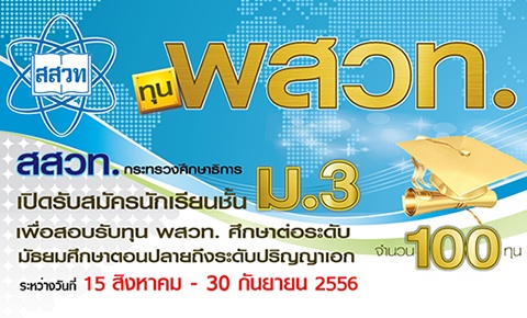 สถาบันส่งเสริมการสอนวิทยาศาสตร์และเทคโนโลยี (สสวท.) กระทรวงศึกษาธิการ เป็นหน่วยงานของรัฐซึ่งมีพันธกิจหลักในการพัฒนาและส่งเสริมผู้มีความสามารถพิเศษทางด้านวิทยาศาสตร์ คณิตศาสตร์และเทคโนโลยี มีความประสงค์เปิดรับสมัครนักเรียนที่กำลังศึกษาในชั้นมัธยมศึกษาปีที่ ๓ ปีการศึกษา ๒๕๕๖ เพื่อสอบคัดเลือกเข้าเป็นนักเรียนทุนพัฒนาและส่งเสริมผู้มีความสามารถพิเศษทางวิทยาศาสตร์และเทคโนโลยี (ทุน พสวท.) ระดับมัธยมศึกษาตอนปลาย เข้าศึกษาต่อในโรงเรียนศูนย์ พสวท. ทั้ง ๑๐ แห่ง ประจำปีการศึกษา ๒๕๕๗ จำนวน ๑๐๐ คน รายละเอียดดังต่อไปนี้