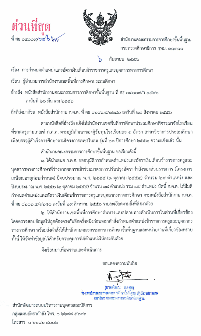 ด่วนที่สุด ที่ ศธ 04009/ว4628 เรื่อง การกำหนดตำแหน่งและอัตราเงินเดือนข้าราชการครูและบุคลากรทางการศึกษา