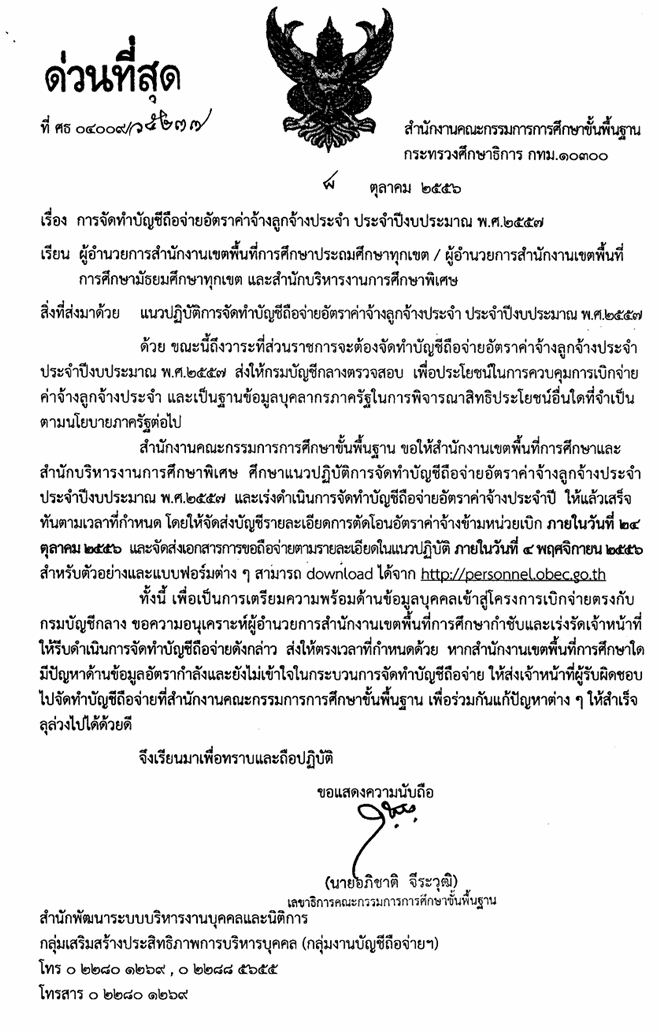 ด่วนที่สุด ที่ ศธ 04009/ว5237 การจัดทำบัญชีถือจ่ายอัตราค่าจ้างลูกจ้างประจำ ประจำปีงบประมาณ พ.ศ.2557