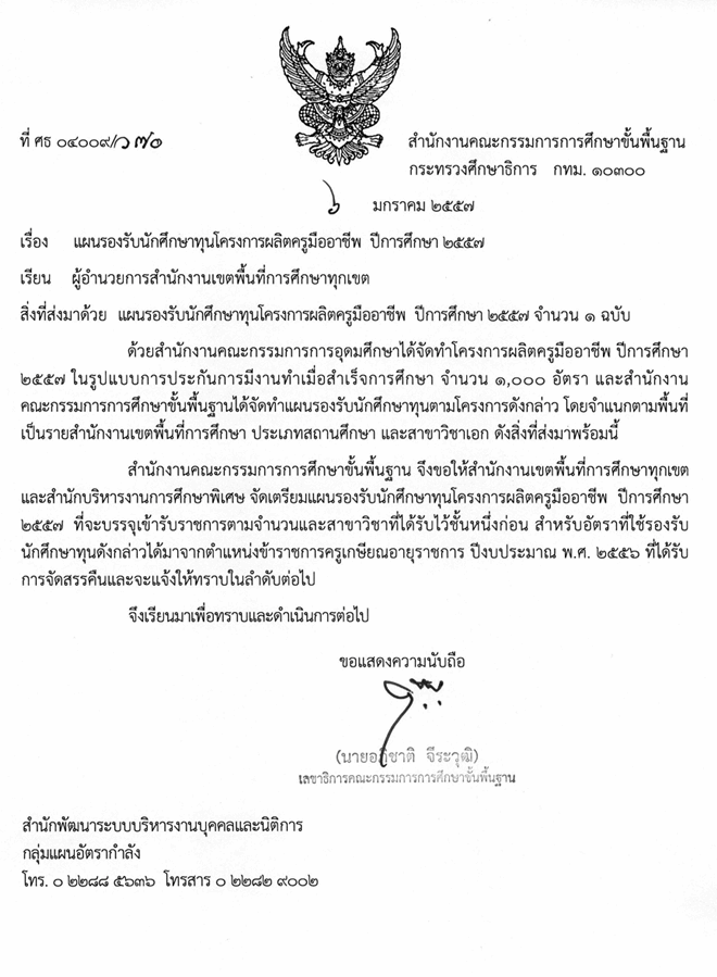 ที่ ศธ 04009/ว70 แผนรองรับนักศึกษาทุนโครงการผลิตครูมืออาชีพ ปีการศึกษา 2557