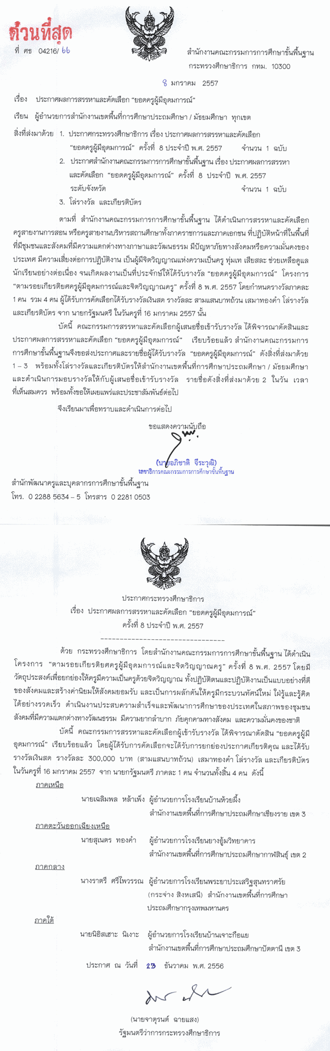 ประกาศผลการสรรหาและคัดเลือก "ยอดครูผู้มีอุดมการณ์"