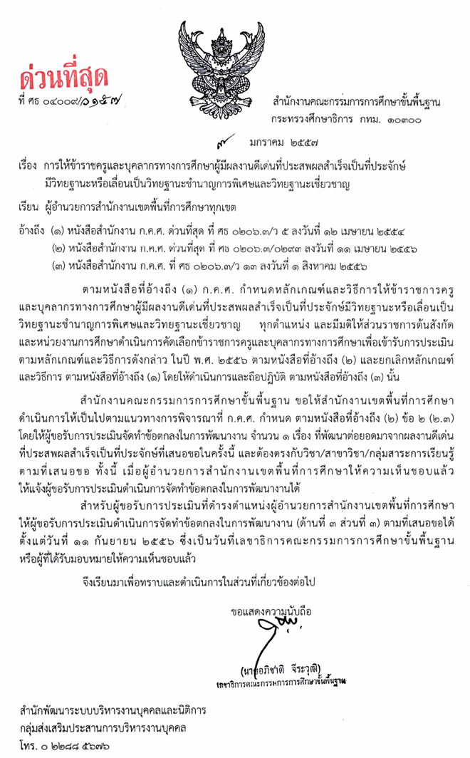 การให้ข้าราชการครูและบุคลากรทางการศึกษาผู้มีผลงานดีเด่นที่ประสพผลสำเร็จเป็นที่ประจักษ์มีวิทยฐานะหรือเลื่อนเป็นวิทยฐานะชำนาญการพิเศษและวิทยฐานะเชี่ยวชาญ