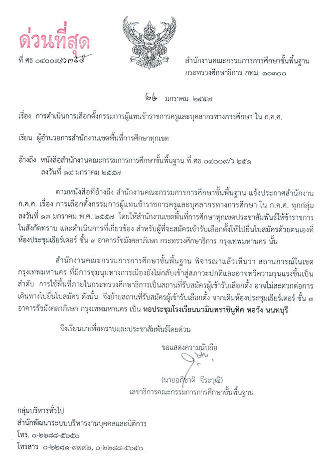 ด่วนที่สุด ที่ ศธ 04009/ว 355 การดำเนินการเลือกตั้งกรรมการผู้แทนข้าราชการครูและบุคลากรทางการศึกษา ใน ก.ค.ศ.