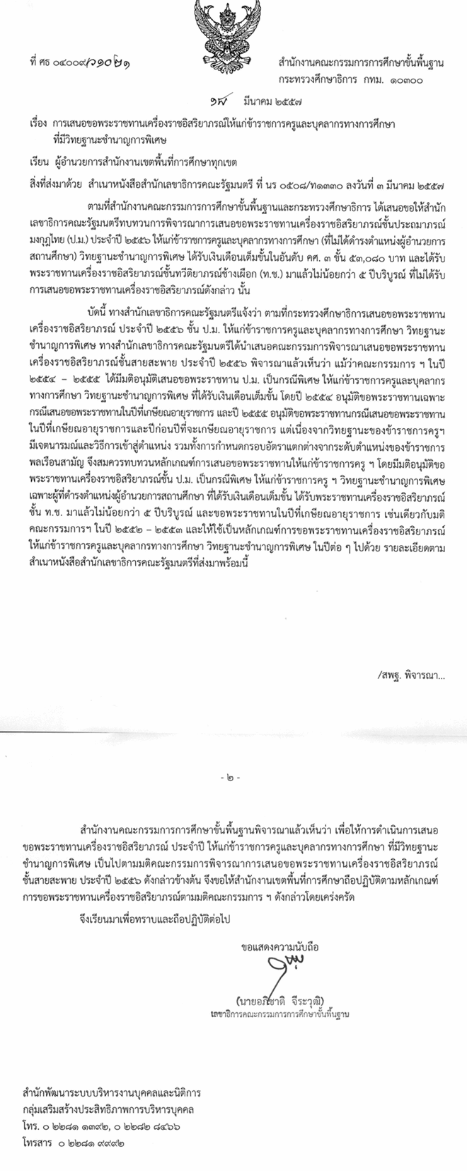 ที่ ศธ 04009/ว1021 การเสนอขอพระราชทานเครื่องราชอิสริยาภรณ์ให้แก่ข้าราชการครูและบุคลากรทางการศึกษาที่มีวิทยฐานะชำนาญการพิเศษ
