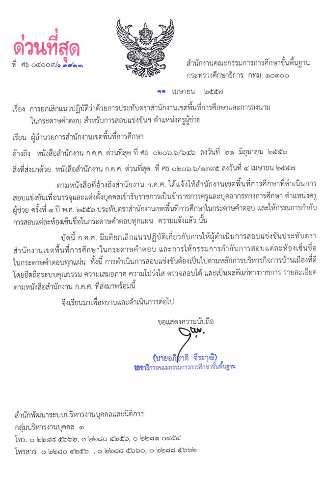 ก.ค.ศ.ยกเลิกแนวปฏิบัติว่าด้วยการประทับตรา สพท.และการลงนามในกระดาษคำตอบในการสอบแข่งขันฯตำแหน่งครูผู้ช่วย