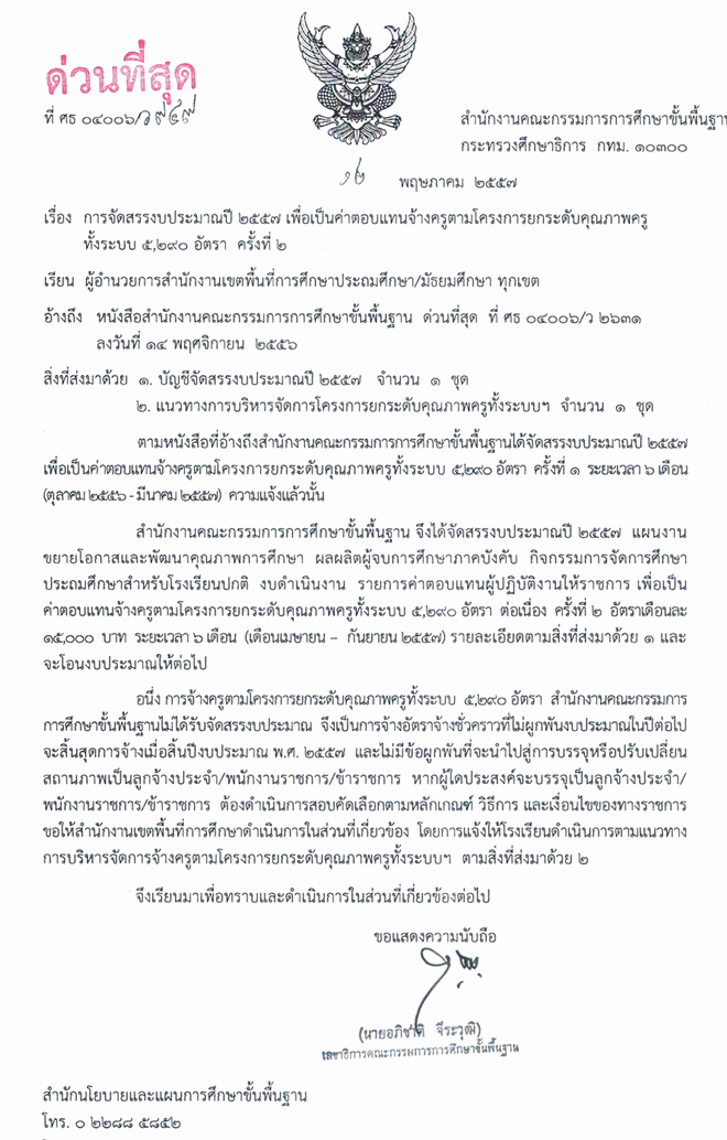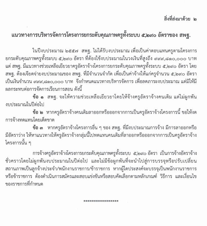 การจัดสรรงบประมาณปี 2557 เพื่อเป็นค่าตอบแทนจ้างครูตามโครงการยกระดับคุณภาพครูทั้งระบบ 5,290 อัตรา ครั้งที่ 2
