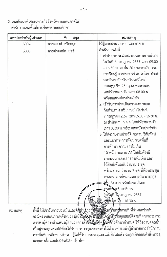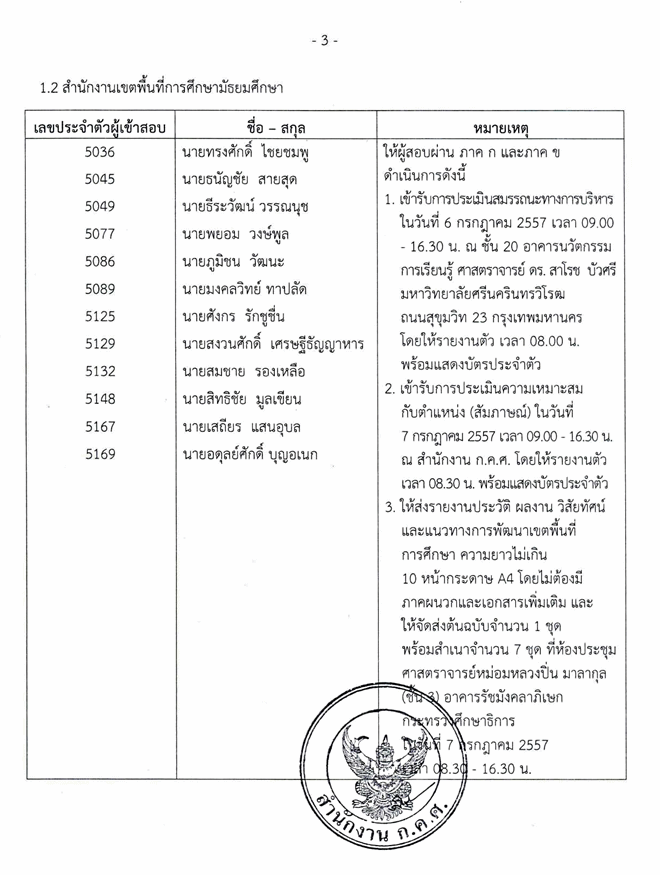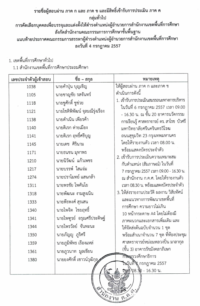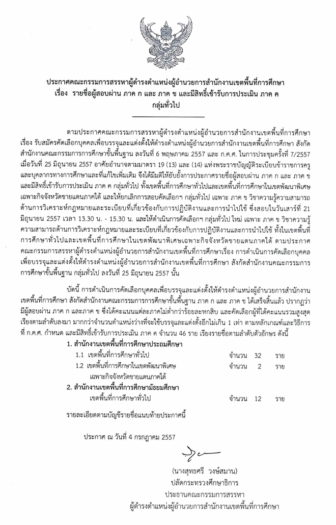 ตามที่ ก.ค.ศ. กำหนดให้มีการสอบคัดเลือกบุคคลเพื่อแต่งตั้งให้ดำรงตำแหน่งผู้อำนวยการสำนักงานเขตพื้นที่การศึกษา กลุ่มทั่วไป ภาค ข เมื่อวันที่ 3 กรกฎาคม 2557 ณ มหาวิทยาลัยศรีนครินทรวิโรฒ ประสานมิตร นั้น บัดนี้การสอบได้ดำเนินการเสร็จสิ้นทั้ง 2 ภาค คือ ภาค ก และ ภาค ข แล้ว สำนักงาน ก.ค.ศ. จึงประกาศผลมาพร้อมนี้