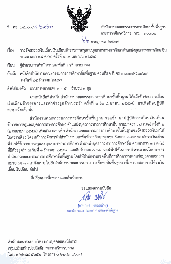 ที่ ศธ 04009/ว2913 การจัดสรรเงินเดือนข้าราชการครูและบุคลากรทางการศึกษา ตำแหน่งบุคลากรทางการศึกษาอื่น ตามมาตรา 38ค.(2)ครั้งที่ 1(1 มษายน 2557)