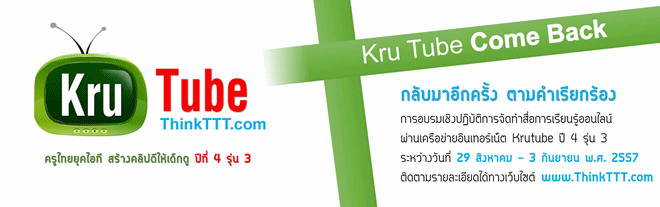 การอบรมเชิงปฏิบัติการการจัดทำสื่อการเรียนรู้ออนไลน์ผ่านเครือข่ายอินเทอร์เน็ต (KruTube Channel : ครูไทยยุคไอที สร้างคลิปดีให้เด็กดู) ปีที่ 4 รุ่นที่ 3 ระหว่างวันที่ 29 สิงหาคม – 3 กันยายน 2557 ณ โรงแรมแม็กซ์ พระรามเก้า กรุงเทพมหานคร