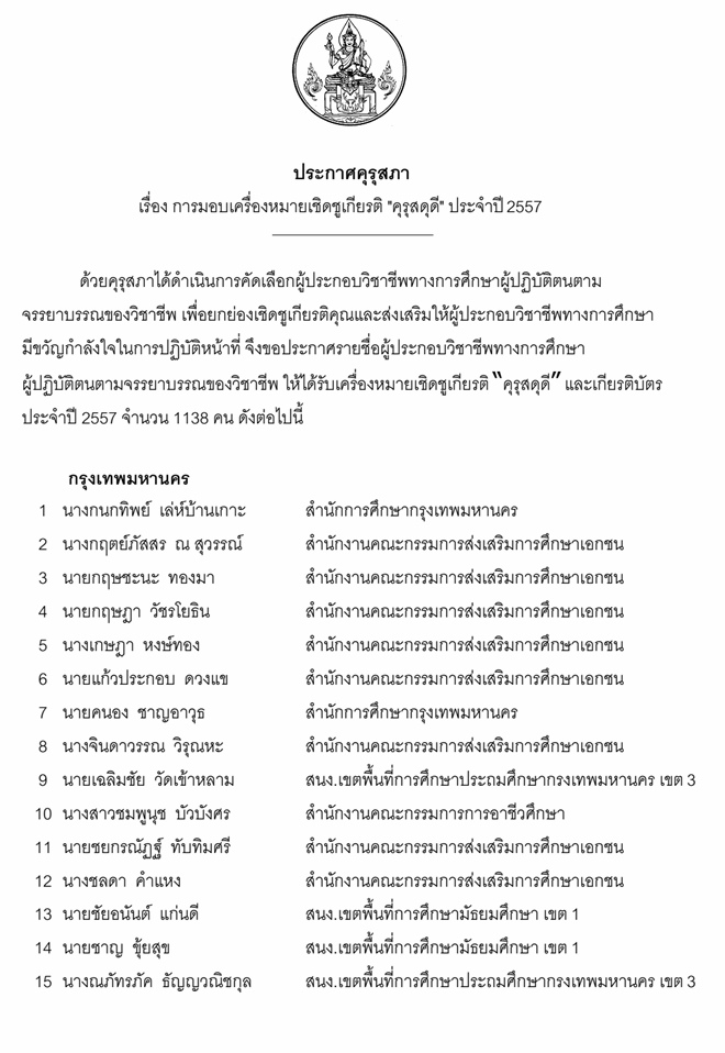 ประกาศคุรุสภา เรื่อง การมอบเครื่องหมายเชิดชูเกียรติ "คุรุสดุดี" ประจำปี 2557