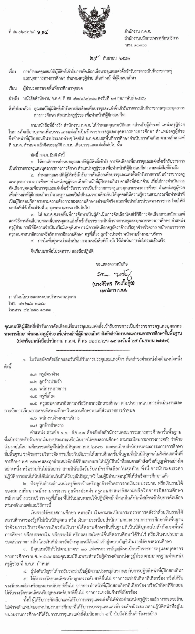 ว14/2557 การกำหนดคุณสมบัติผู้มีสิทธิ์เข้ารับการคัดเลือกเพื่อบรรจุและแต่งตั้งเข้ารับราชการเป็นข้าราชการครูและบุคลากรทางการศึกษา ตำแหน่งครูผู้ช่วย เพื่อทำหน้าที่ผู้ฝึกสอนกีฬา